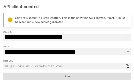 Copy the Client ID, Secret, and Base URL to Interpres. If setting up more than one CrowdStrike integration (e.g. CrowdStrike Falcon EDR and CrowdStrike Spotlight) then do not click Done until you have used these credentials for both integrations.